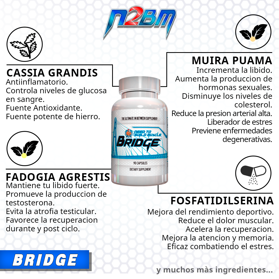 La marca N2BM Nutrition atiende todas las necesidades del atleta natural y del usuario de esteroides. Por eso desarrollo la formula de BRIDGE que está lleno de poderosos ingredientes que lo ayudan a mantener los aumentos musculares que obtiene durante su programa de entrenamiento intenso, pero eso no es todo, hace algo muy importante dentro su organismo, lo ayuda a limpiar renovando todos los receptores y toxinas que impiden el crecimiento y recuperación del musculo.