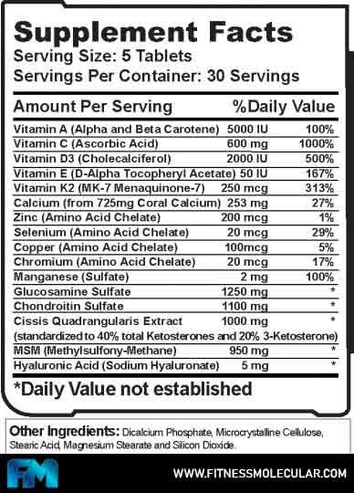 Vitamina A, Vitamina C, Vitamina D3, Vitamina E, Vitamina K2, Selenio, Sulfato de manganeso, cobre, cromo, Calcio y Zinc.